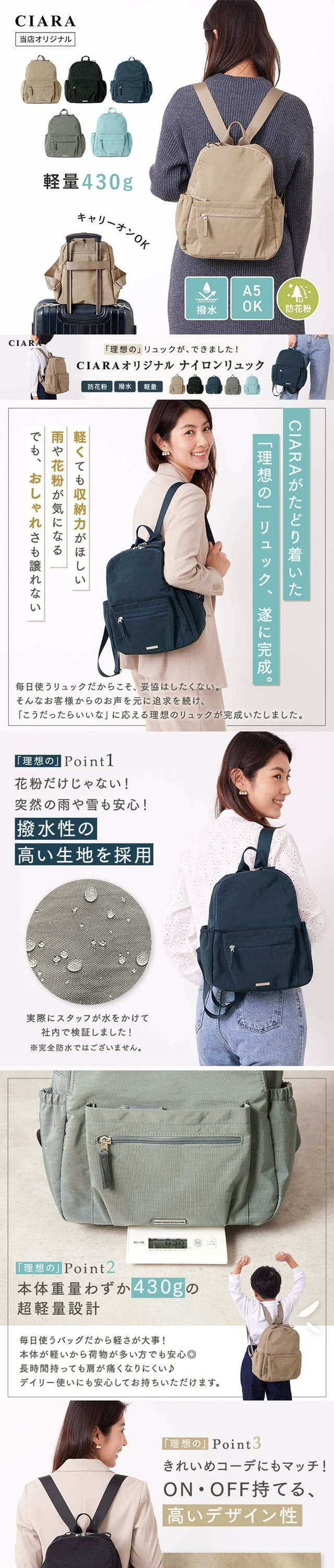防花粉 花粉対策 キャリーオン バッグ レディース デイバッグ リュック ミニリュック リュックサック ナイロンママバッグ マザーズバッグ 旅行バッグ 無地 シンプル メンズ ユニセックス 大容量 自立 ファスナー付き チャック付き 多収納 軽い 軽量 収納 実用性 丈夫 小さめ 大人 女性たっぷり 使いやすい 多機能 高性能 ポケット ファスナー 旅行 ビジネス デイリー 仕事 オフィス 通勤 通学 出張 トラベル 持ち歩き女子 大学生 ママ OL 会社員 20代 30代 40代 50代 60代 70代 80代 小学生 中学生 高校生 林間学校 学童かわいい 可愛い おしゃれ きれいめ 高見え カジュアル 子供 キッズ 男の子 女の子バレンタインデー バレンタイン ホワイトデー お返し 母の日 お婆ちゃんクリスマス 誕生日 新生活 カジュアルバッグ 自転車通勤 旅行用 速乾 ハイキング レジャー フェス フェスバッグ 贈り物 プレゼント プチギフトギフト 福袋 セール お得 新作 ポイント消化 CIARAポーチ雑貨屋 シアラ OEM 大量注文 ネスリーフ 2026 送料無料