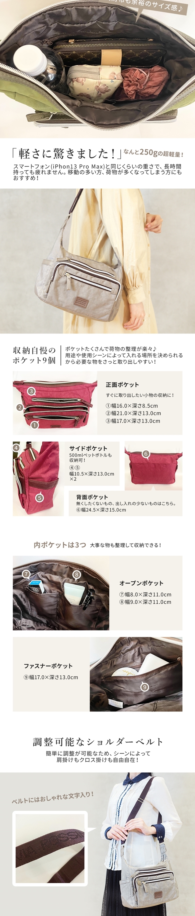 ポケットがたくさんで、持ちやすい軽いショルダーバッグ