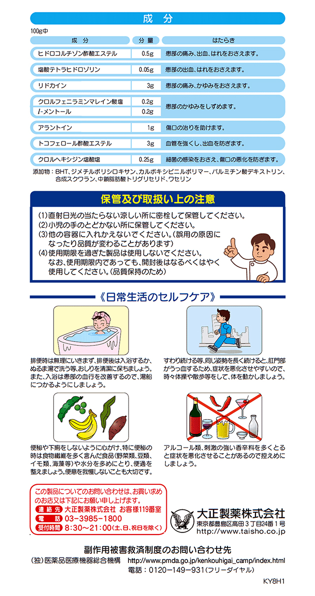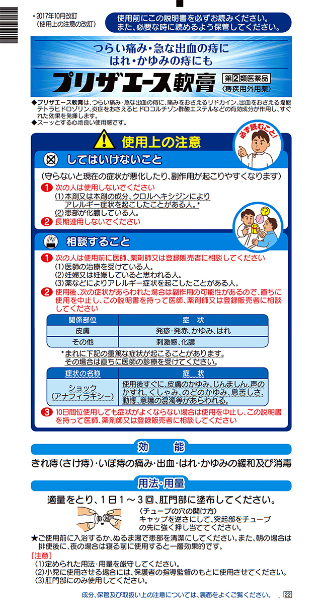 商品名 指定第2類医薬品 プリザエース軟膏15g 大正製薬 容量 15g JANコード 4987306061477 メーカー 大正製薬 カテゴリー 医療・介護・医薬品>医薬品>おしり関連薬>おしり関連薬【第一・二類医薬品(指定第二医薬品含む)】 効果・効能 きれ痔(さけ痔)・いぼ痔の痛み・出血・はれ・かゆみの緩和及び消毒 用法・用量 適量をとり、1日1~3回、肛門部に塗布してください。