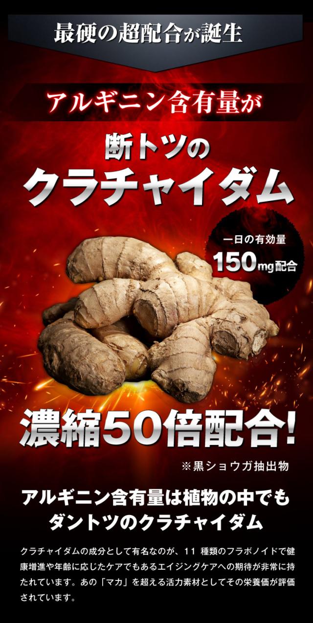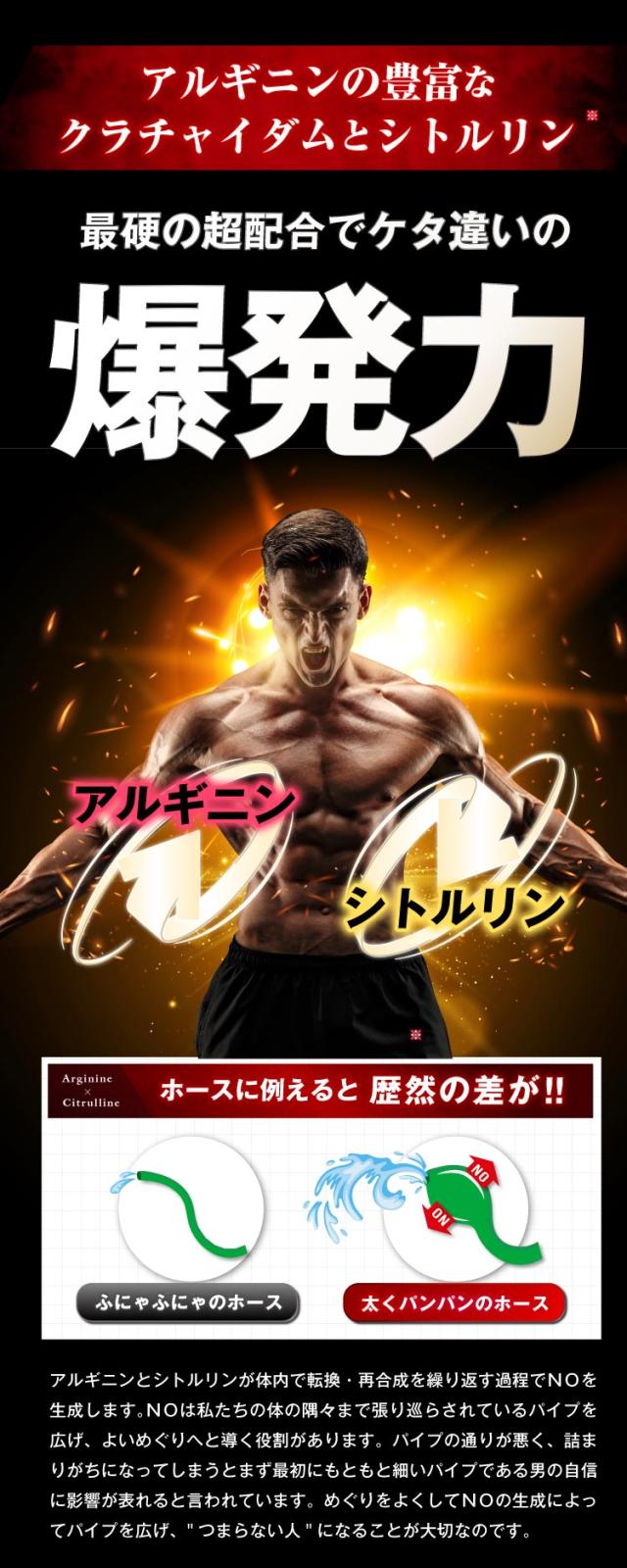 クラチャイダムとシトルリンの超配合こそが最硬のオトコの起爆をサポート 【アルギニン】 クラチャイダムに豊富に含まれるアルギニンはタンパク質を構成する必須アミノ酸の一種で、体作りには欠かせません。体内でシトルリンへと変換される際に、NOを産生します。 【シトルリン】 シトルリンはアミノ酸の一種で、日本のスイカの中から発見されました。体内でアルギニノコハク酸を経てアルギニンへと再合成されます。 アルギニンとシトルリンが体内で変換されることでNOが生成されオトコのめぐりをパンパンにするこのサイクルこそが折れない最硬の自信を導く秘訣です。