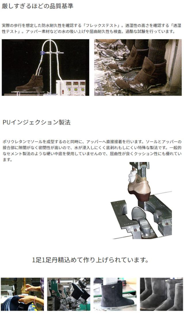 ポリウレタンでソールを成型するのと同時に、アッパーへ直接接着を行います。ソールとアッパーの接合部に隙間がなく密閉性が高いので、水が浸入しにくく底剥れもしにくい特殊な製法です。一般的なセメント製法のような硬い中底を使用していませんので、屈曲性が良くクッション性にも優れています。