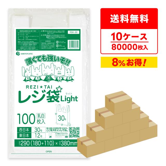 レジ袋 買い物袋 薄手 西日本 30号 (東日本12号) ブロック有 乳白 0.011mm厚 100枚x80冊x10箱 RSK-30-10/手提げ袋 持ち手付き袋 S ホワイト 送料無料