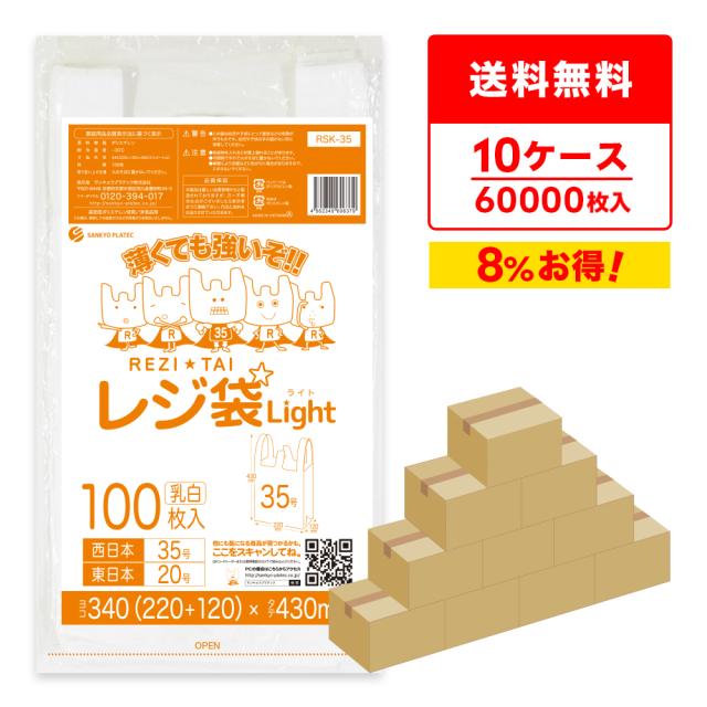 レジ袋 買い物袋 薄手 西日本 35号 (東日本20号) ブロック有 乳白 0.011mm厚 100枚x60冊-10 RSK-35-10/手提げ袋 持ち手付き袋 M ホワイト 送料無料