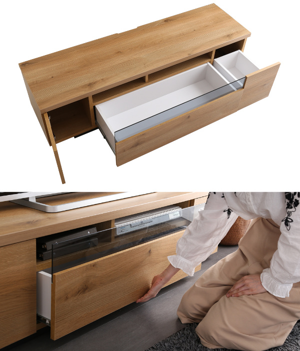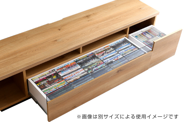 大小2つの大容量の引出しは、DVDやCD、周辺機器の収納に便利です。引出しは、奥の物を取り出しやすいフルオープン設計です。