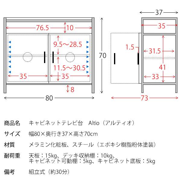 耐荷重 天板:15kg、デッキ収納棚:10kg、キャビネット可動棚:5kg、キャビネット底板:5kg