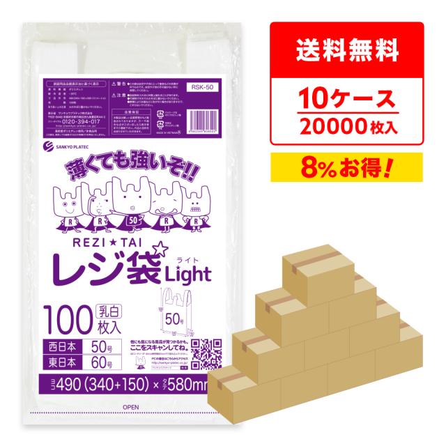 レジ袋 買い物袋 薄手 西日本 50号 (東日本60号) ブロック有 乳白 0.018mm厚 100枚x20冊x10箱 RSK-50-10/手提げ袋 持ち手付き袋 3L ホワイト 送料無料