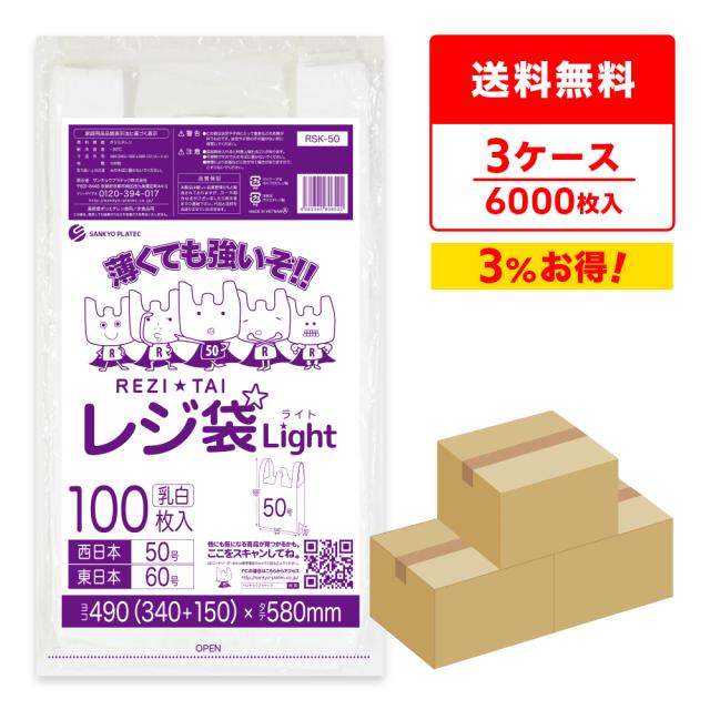 レジ袋 買い物袋 薄手 西日本 50号 (東日本60号) ブロック有 乳白 0.018mm厚 100枚x20冊x3箱 RSK-50-3/手提げ袋 持ち手付き袋 3L ホワイト 送料無料