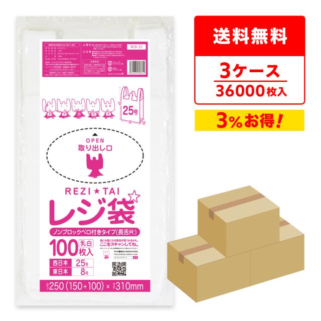 レジ袋 薄手 長舌片タイプ 西日本 25号 (東日本8号) ブロック無 乳白 0.011mm厚 100枚x120冊x3箱 RCK-25-3 /手提げ袋 持ち手付き袋 SS ホワイト 送料無料