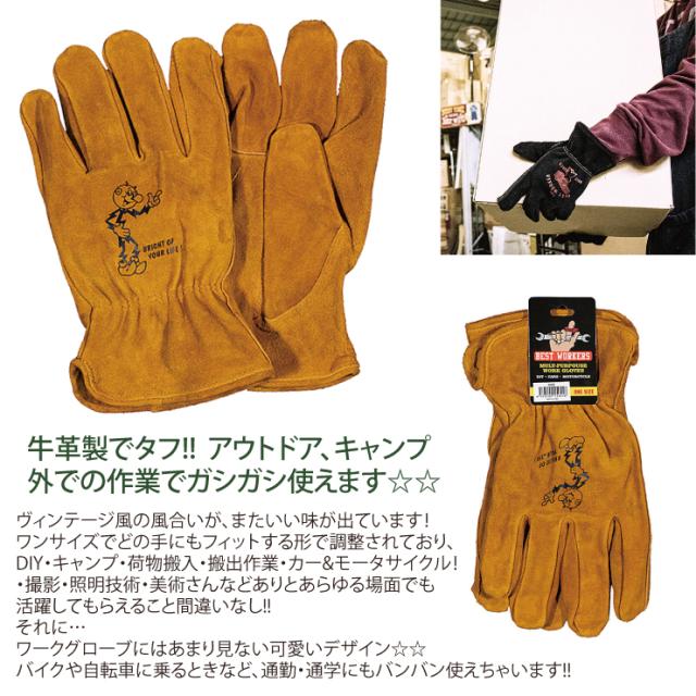 【メール便発送】牛革 ヴィンテージグローブ アメリカンキャラクター 手袋 キャンプ アウトドア アメリカン雑貨 4種類 生活雑貨【グローブ USA 通勤 通学 フィット感 重宝 フリーサイズ 荷物搬入・搬出作業 便利 かわいい】┃