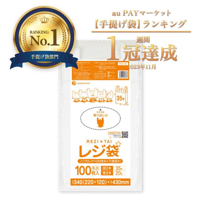 レジ袋 35号 (東日本20号) Mサイズ 乳白 薄手タイプ ブロック無 0.011mm厚 100枚x60冊 RCK-35 長舌片タイプ 買い物袋 手提げ袋 持ち手付き袋 携帯ゴミ袋 ホワイト 送料無料 サンキョウプラテック