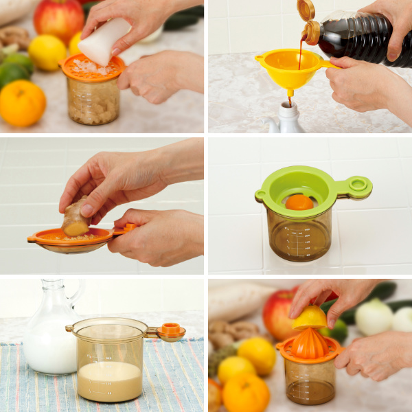 ●薬味おろし、大根おろし、レモン搾り、黄身取り、ロート、計量カップ、の6つの機能を兼ね備えた、計量カップの調理器具セットです。