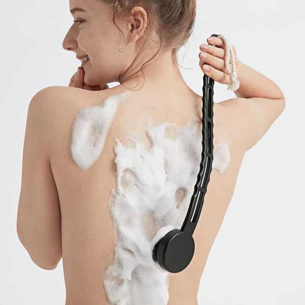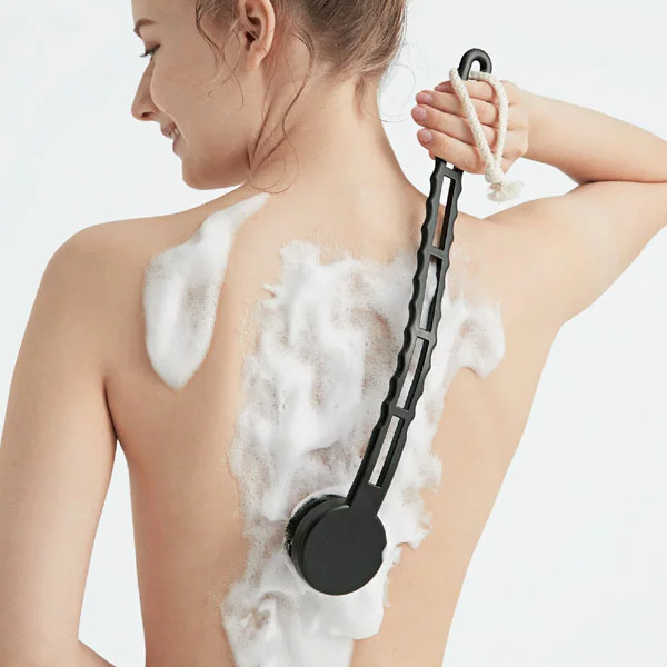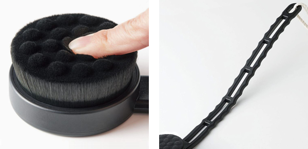| 約70万本の極細毛 約70万本、約77.5マイクロメートルの極細毛で肌触り滑らかです。毛の長さで作った凹凸がより肌に馴染みます。 | 握りやすい波状ハンドル 手にフィットして握りやすい波状ハンドルです。緩やかなカーブがより背中を洗いやすくなっています。 |
