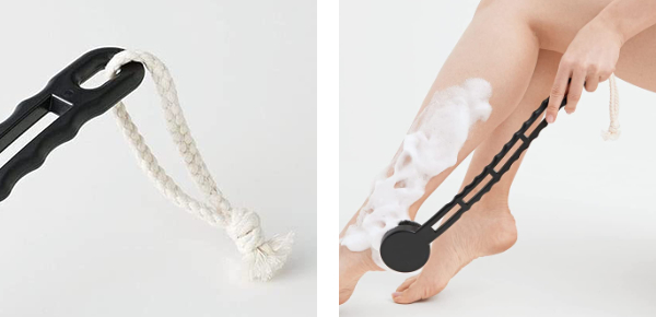 | 吊り下げ収納が可能 バスルーム内で吊り下げて収納できるひも付きです。水切りにもなり清潔をキープできます。 | 背中だけでなく全身に 背中だけでなく、ふくらはぎなど脚にも、楽な体勢で全身にお使いいただけます。 |