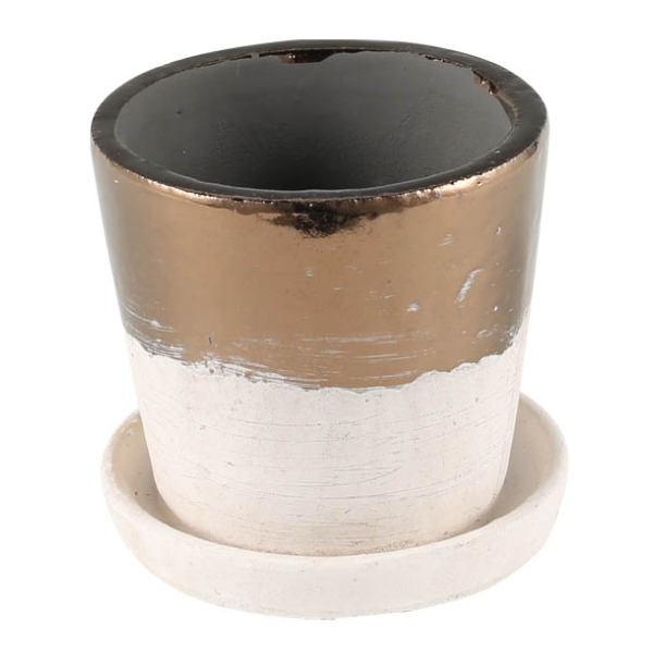 定番のテラコッタ素材を生かしたベーシックな色と、華やかなブロンズのツートンカラーが魅力のポットです。ハンドメイドで一点一点異なる風合いも魅力の一つです。お好みの植物を植えてあなたのグリーンライフをお楽しみください。