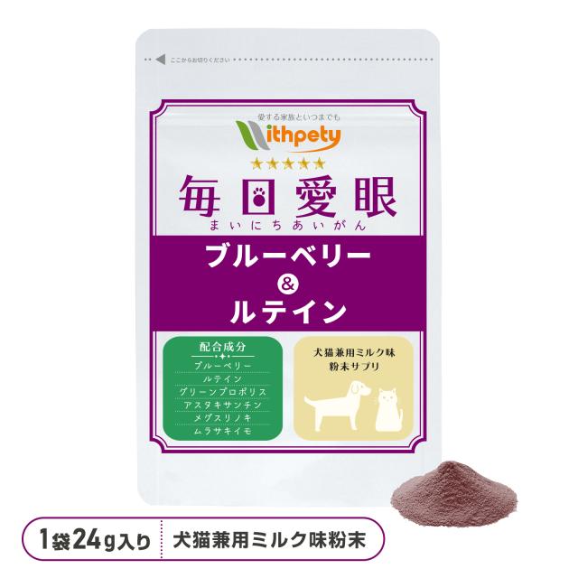 「犬猫兼用(粉末ミルク味)毎日愛眼 ブルーベリー&ルテイン」は6種類の成分を配合した目のサポートサプリメントです。配合成分はブルーベリー(ビルベリー)・ルテイン(マリーゴールド)・プロポリスエキス・アスタキサンチン・メグスリノキエキス・紫イモとなります。 ウィズペティのペットサプリメントは国産品質、GMP、ペットフード安全法、残留農薬のポジティブリストに基づき、香料・着色料・保存料・化学調味料を使用せずに製造しています。全犬種・全猫種が食べやすいミルク味粉末タイプです。(ミルク味粉末/1袋24g/付属スプーン付き60杯分)