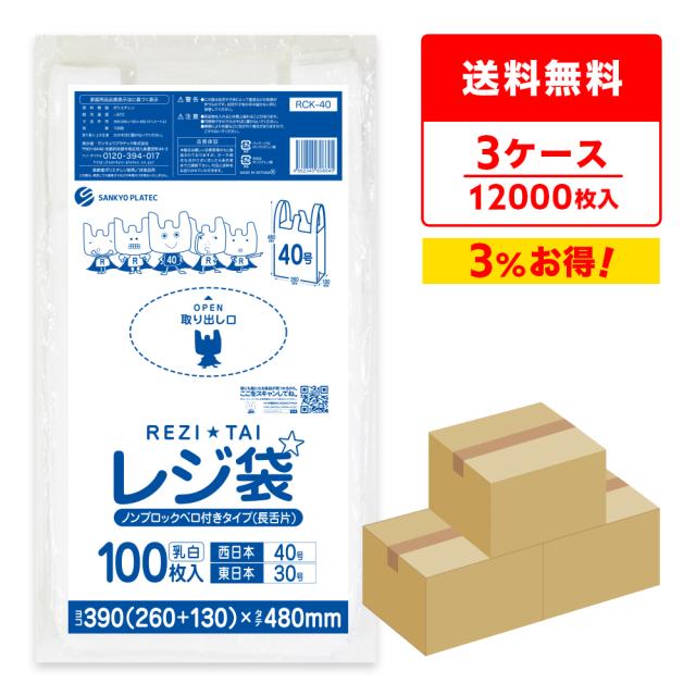 レジ袋 薄手 長舌片タイプ 西日本 40号 (東日本30号) ブロック無 乳白 0.013mm厚 100枚x40冊x3箱 RCK-40-3 /手提げ袋 持ち手付き袋 L ホワイト 送料無料