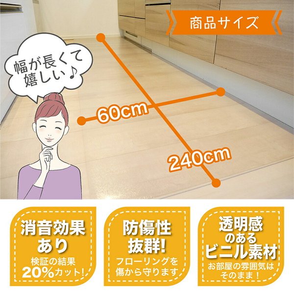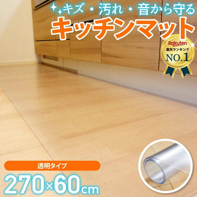 キッチンマット 透明 270cmx60cmx1.5mm クリア【国際標準規格準拠】 キッチン マット おしゃれ 撥水 台所 フロア 床暖房対応 PVC チェアマット