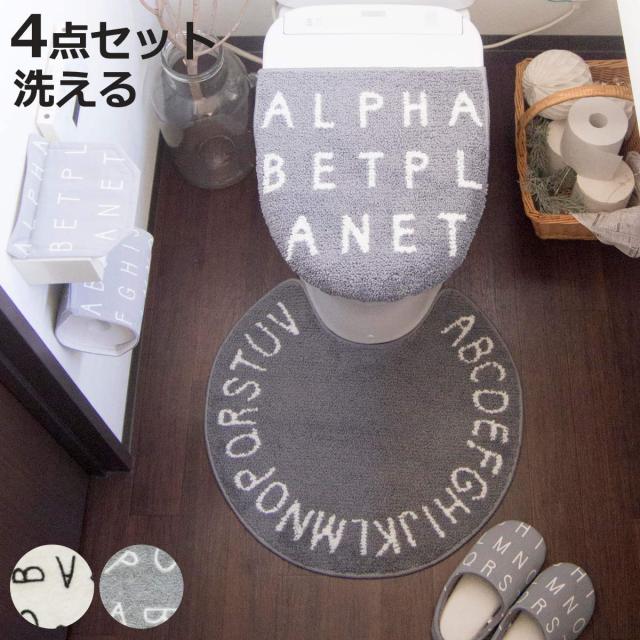 トイレマット セット 4点セット ソルトルトイレ4点セット アルファベット ( 蓋カバー トイレスリッパ トイレットペーパーホルダーカバー ホワイト グレー マット カバー スリッパ ペーパーホルダーカバー 兼用フタカバー 55×60cm )