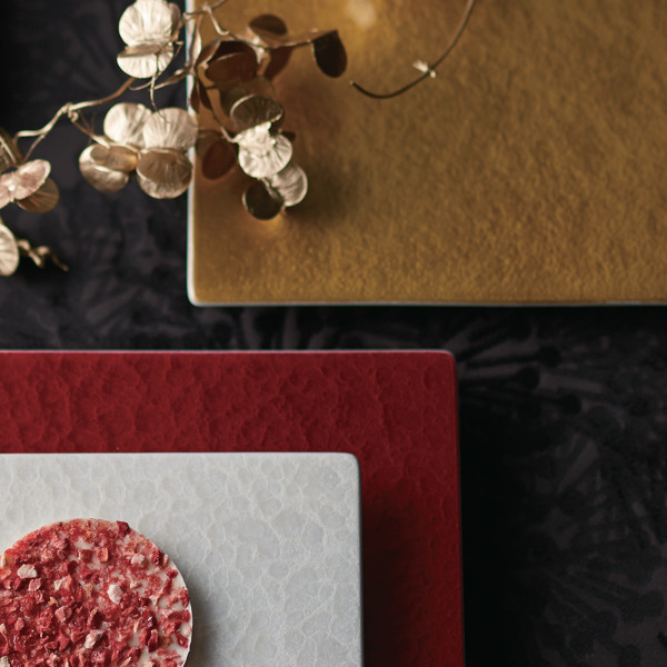 華やかでモダンなデザインの漆石シリーズです。有田焼や美濃焼の素地に漆を吹き付けてコーティングされており、こすっても塗装が落ちにくくなっています。おもてなしや特別な日のお料理にぴったりです。