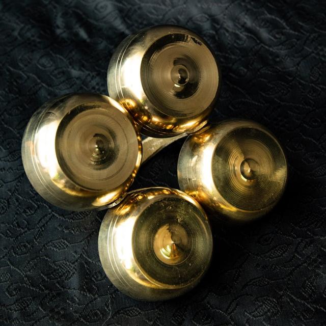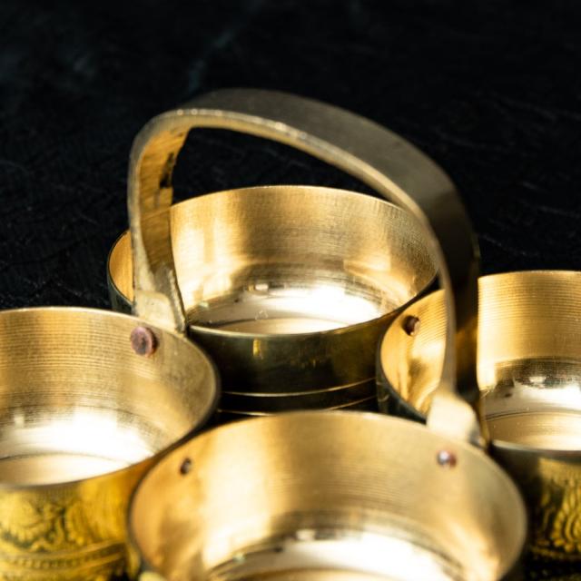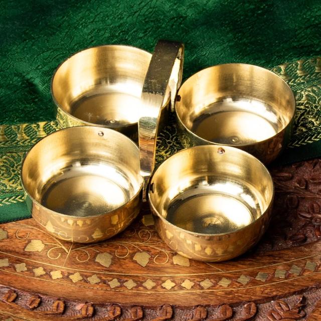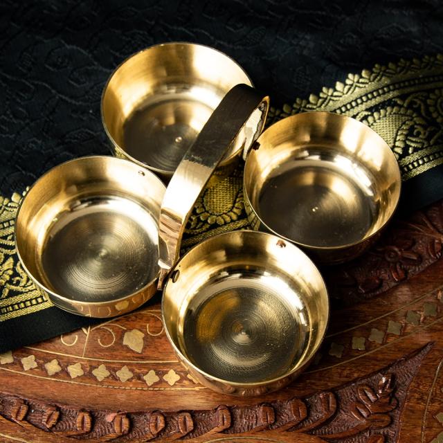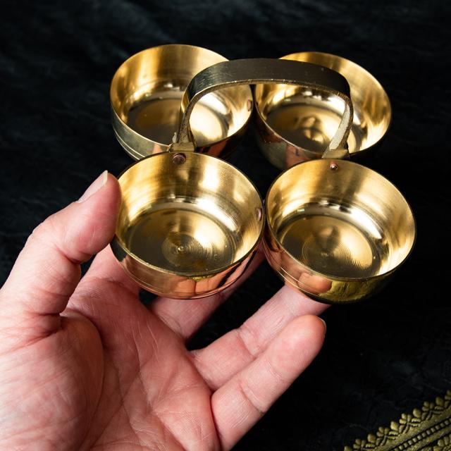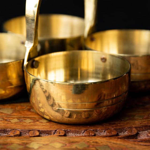 ブラスでできたチャトニ(薬味)ボウルです。インドでは4つのボウルにそれぞれスパイスや薬味類を入れ、持ち手がついているので持ち運びが簡単にできとても便利ですね。黄金色の金属でできているので食卓周りを美しく豪華にしてくれそうです。