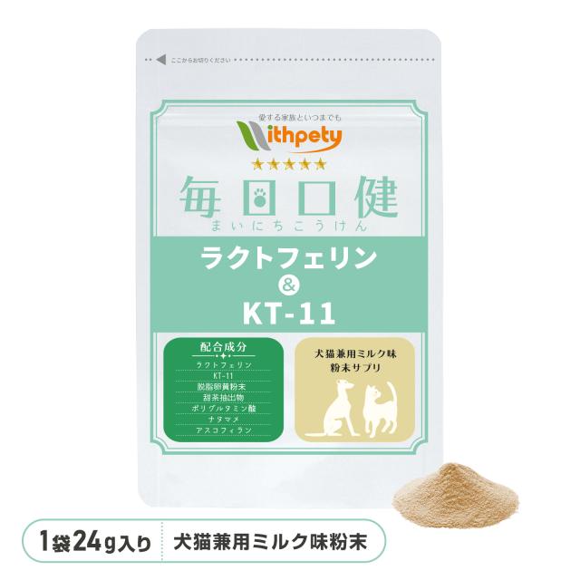 「犬猫兼用・毎日口健 ラクトフェリン&KT-11」はお口の健康維持のため7種類の成分(ラクトフェリン・KT-11・卵黄粉末〔グロビゲン〕・甜茶抽出物・ポリグルタミン酸・ナタマメ・アスコフィラン)を配合しています。 安心安全の国産品質、GMP、ペットフード安全法、残留農薬のポジティブリストに基づき、香料・着色料・保存料・化学調味料を使用せずに製造しています。全犬種・全猫種が食べやすいミルク味粉末タイプです。(ミルク味粉末/1袋24g/付属スプーン付き60杯分)。