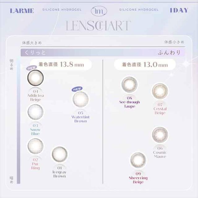 カラー:クリスタルベージュ,コズミックモーヴ,シアーリングベージュ,シースルートープ,アディクティーベージュ,ウォーターティントブラウン