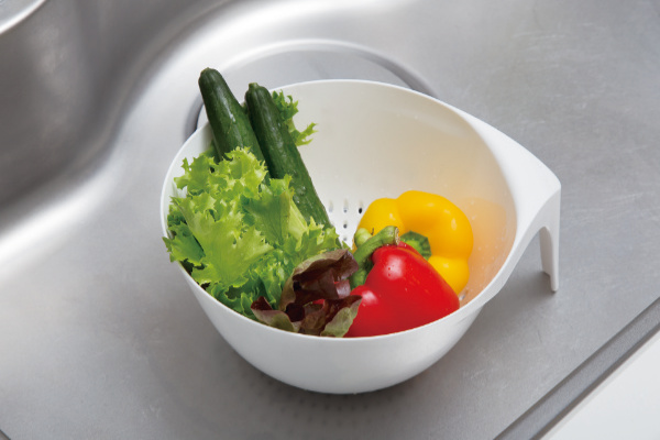 ハンドル付きで持ちやすく、水切りがラクにできます。またボウルの底とハンドルの先が同じ高さなので、ハンドル部分が支えになり置くときも安定してくれます。
