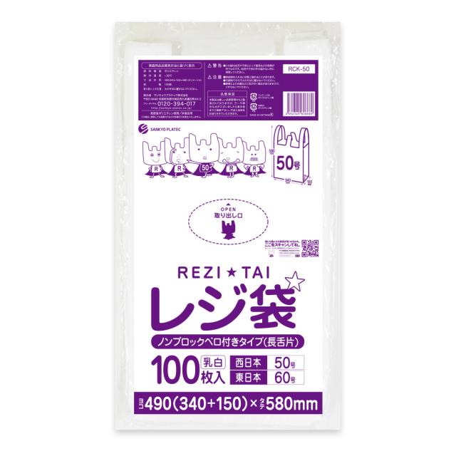 レジ袋 50号 (東日本60号) 3Lサイズ 乳白 薄手 0.018mm厚 100枚 長舌片タイプ ブロック無 RCK-50bara / ポリ袋 ビニール袋 手提げ袋 取っ手付きゴミ袋 買い物袋 持ち手付き袋 サンキョウプラテック