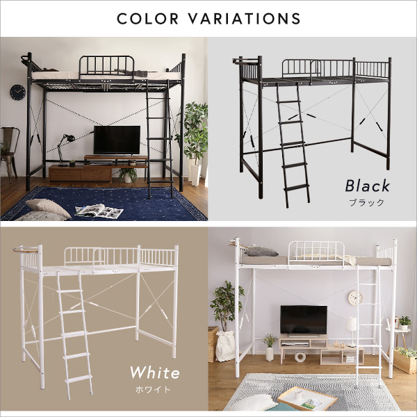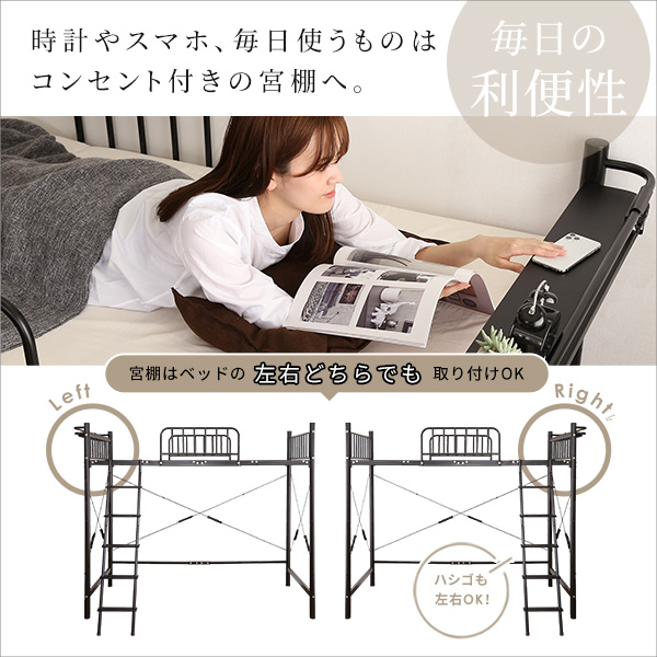 宮付きロフトベッド ロフトベッド ロフトベット ハイベッド ハイベット パイプベッド パイプベット 宮付き 棚付き ブラック ホワイト メッシュ床 ハシゴ付き