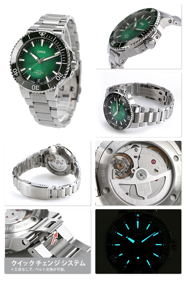 正規品 10年保証キャンペーン オリス アクイス デイト キャリバー400 ダイバーズウォッチ 自動巻き メンズ 腕時計 400-7769-4157M ORIS AQUIS Date caliber 400 アナログ グリーン ◆ORIS(オリス)は、ポール・カッティン氏とジョージ・クリスチャン氏の2人によってスイスのヘルシュタインで創設されました。近くを流れる小川にちなんで社名をオリスと命名。手頃な価格ながら、革新的で高機能かつ実用的な機能を備えた本格機械式時計で知られ、世界中の時計ファンから愛されているブランドです。 ダイバーズウォッチラインの中でも人気の「アクイス」シリーズ。5日間パワーリザーブと高レベルの耐磁性を備えた、キャリバー400モデルが登場。ビジネスシーンでもお使いいただけるシックなデザインもポイント。カジュアルスタイルにはもちろん、クラシックな大人の装いにも味わいを添えてくれます。 発売日:21年6月発売 機械式腕時計