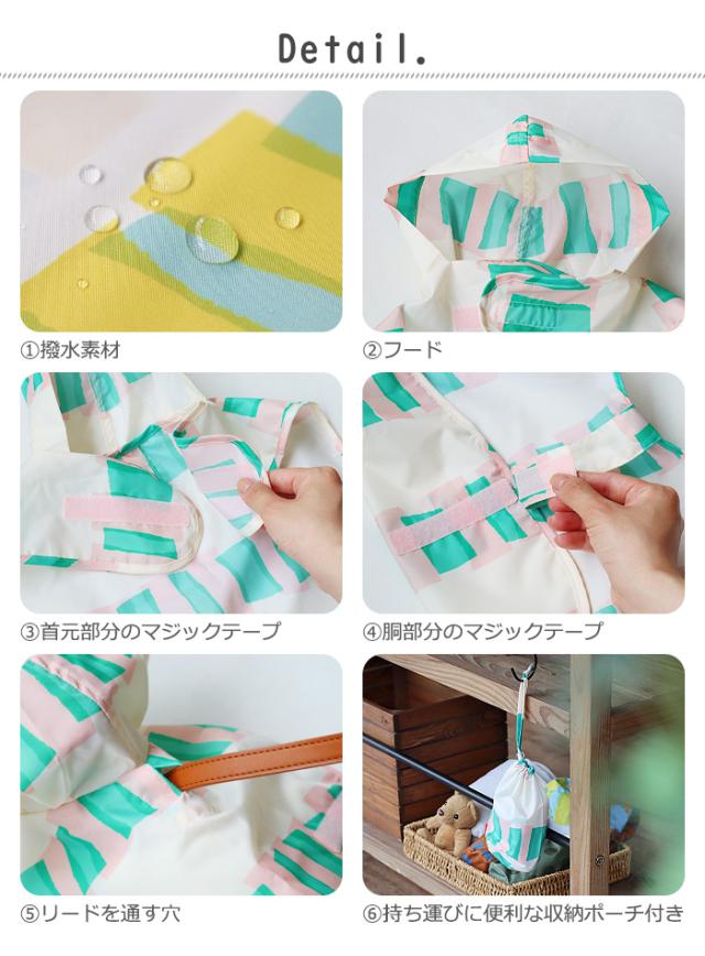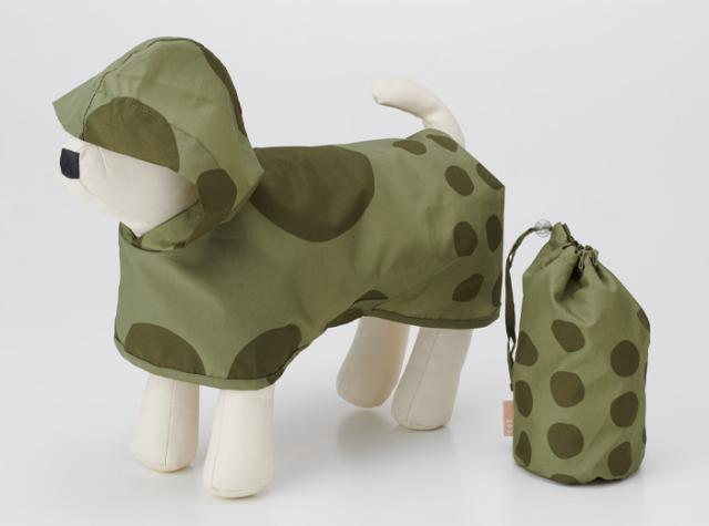 小型犬用のポンチョで胴回りのサイズは約40〜50cm。首元と胴部分にマジックテープがついており着脱が簡単です。撥水する生地を使用しているため、雨でも身体が濡れることを防いでくれます(被っている部分のみ、完全防水ではありません)。いつでも持ち運びができるポンチョと同じカラーの収納ポーチ付きです。デザインは大小様々なドットがキュートなmaru(マル)シリーズとセロファンをペタペタと貼り付けたようなデザインのcellophane(セロファン)シリーズの2種類。カラーも豊富でついつい集めたくなっちゃいます。別売りの「392 plus m レインウェアシリーズ」でお子さまとのリンクコーデも楽しめます。ぜひこのドッグポンチョで雨の日のお散歩を楽しんでみてはいかがでしょうか?