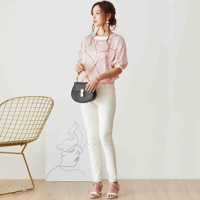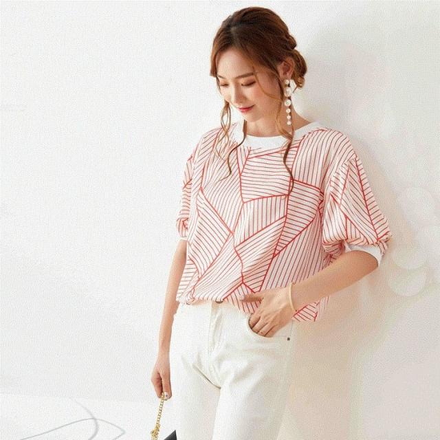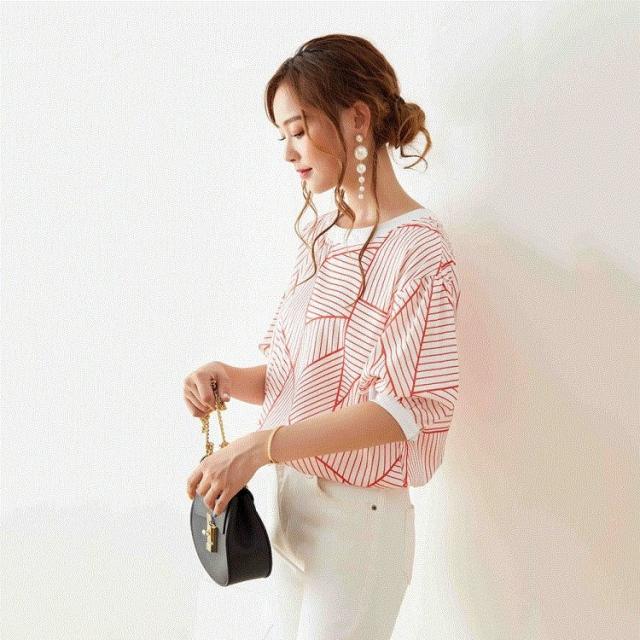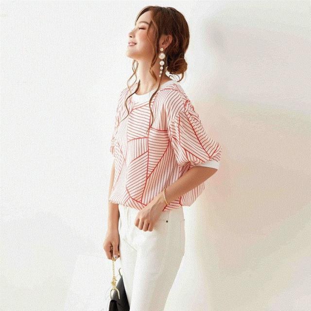 Tシャツ トップス レディース きれいめ 40代 幾何柄 半袖トップス 白インナー オシャレ ブラウス tシャツ 綿 大きいサイズ 着痩せ 韓国風