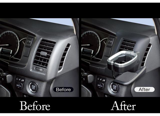 ●200系 4・5・6型のハイエース、ハイエースバン、ハイエースワゴン、ハイエースコミューターの運転席側のエアコン吹き出し口に取り付けるドリンクホルダー。