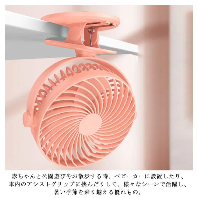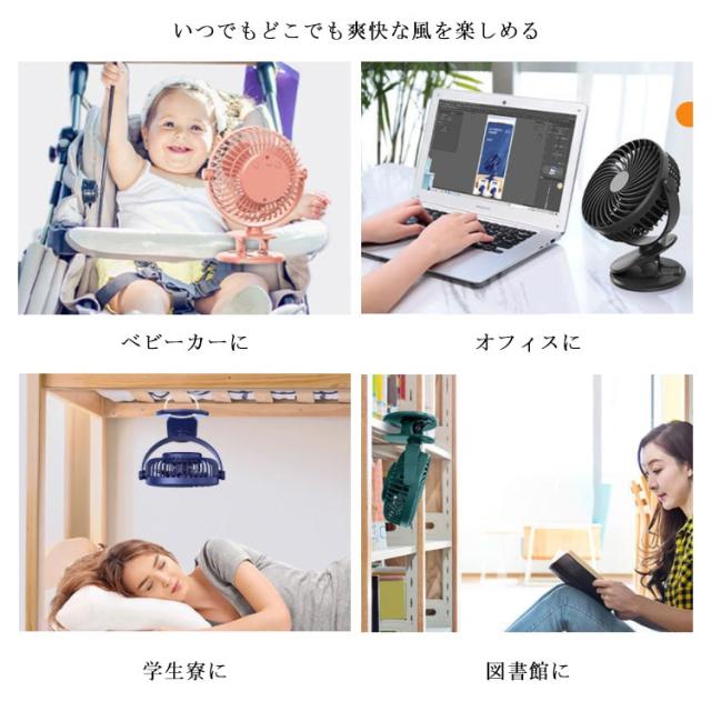 | 角度自由!クリップ式卓上の2WAYミニ扇風機。 携帯に便利なコンパクトサイズ、充電式なので、いつでもどこでも涼しい風を楽しめる。 手動で上下左右に360度回転できるから、広い送風口全方位送風で、車内空気の循環を効率的に行え、エアコン効率アップし、暑い車内を快適空間に♪ 車内、ベビーカー、ペットのケージなどにいろんなところに挟めば、涼しくて快適。暑い季節を乗り切るのに手放せなくなる。 卓上でのご使用もOK。会社や在宅勤務時、デスク周りに置いて、涼しい風を楽しむのも 風量5段階調節可能なので、子供から高齢者までそれぞれ適応の風量を楽しめるから、使い勝手抜群。 5000mAhの大容量で、稼働時間が長く、強力な風量を提供いただけます。 ノイズキャンセリング技術を採用し、わずか20dBの超静音設計で、居眠りや勉強する時も風の音が気にならない。 赤ちゃんと公園遊びやお散歩する時、ベビーカーに設置したり、車内のアシストグリップに挟んだりして、様々なシーンで活躍し、暑い季節を乗り越える優れもの。 | |
