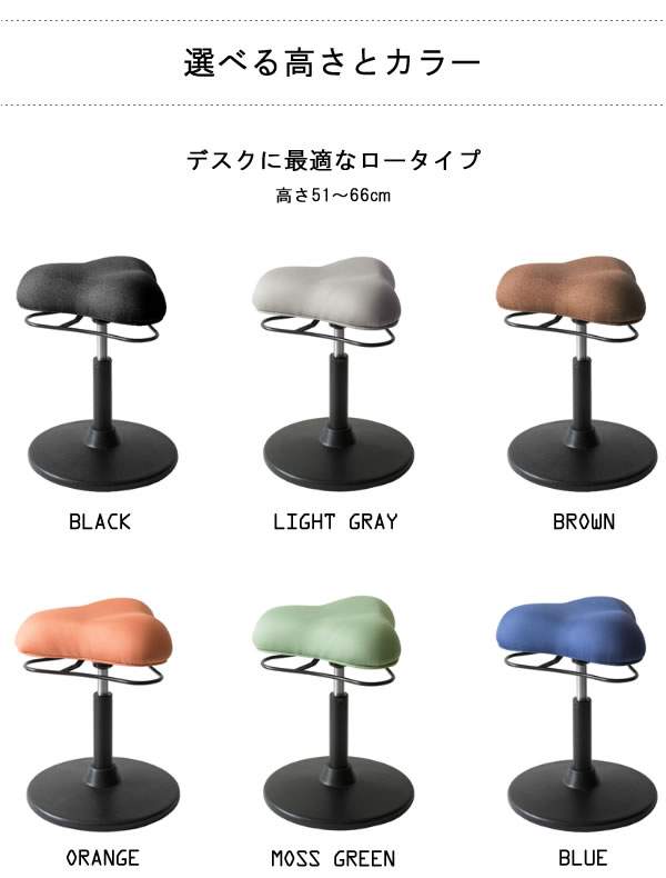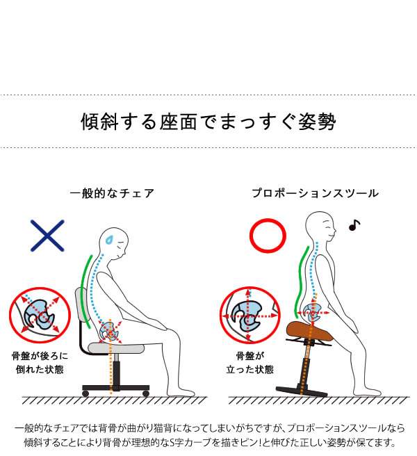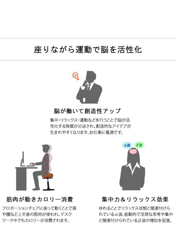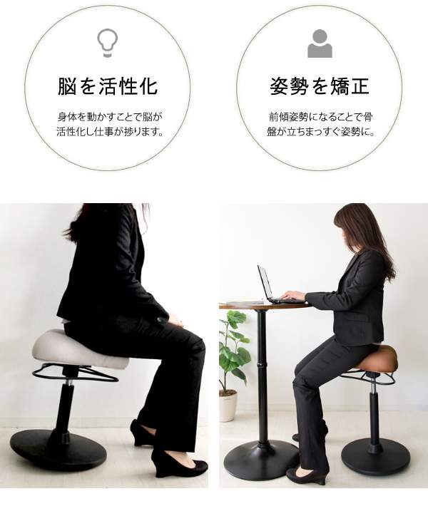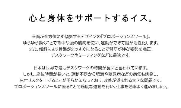 プロポーションスツールに座ることで適度な運動を行い、仕事を効率よく進めましょう。