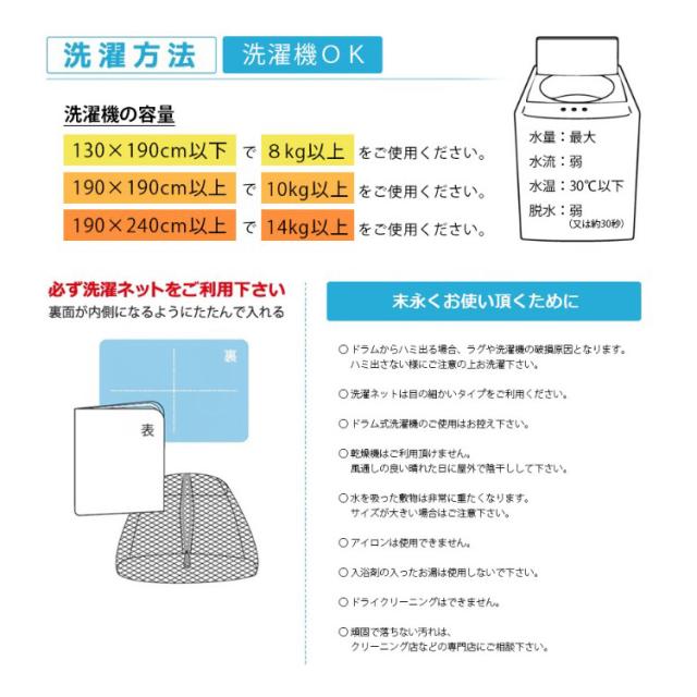 ※洗濯の際には洗濯機の 取扱説明書をお読みのうえ、カーペットに適した洗濯コースをお選びください。ドラム式などの一部の形式の洗濯機ではお洗いいただけない場合があります。