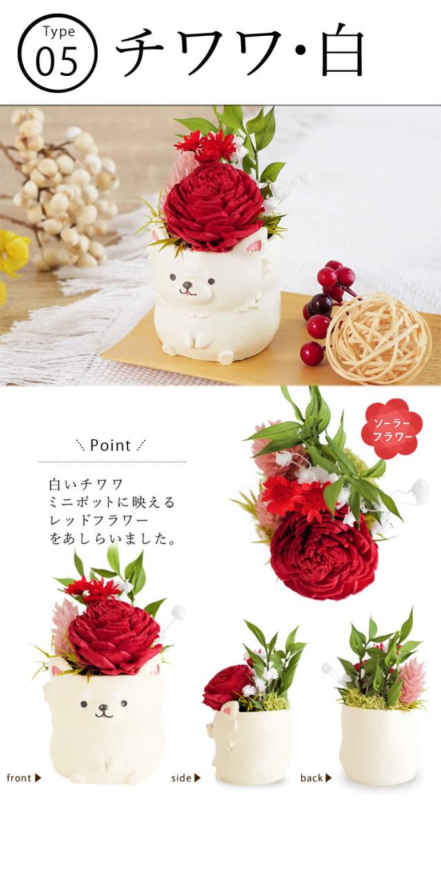 - 母の日も近いのと生花はいらないと言われ探していたらチワワの置物の中にブリザードフラワーが入っていた為購入しました レッド・ホワイトのチワワがお家にいるので黒チワワの方が良いかなと悩みましたが、白チワワを購入 ちょっと早いけど母の日のプレゼントとして渡しました お茶も入ってたみたいで母も気にいったようで可愛いと言ってました ありがとうございました