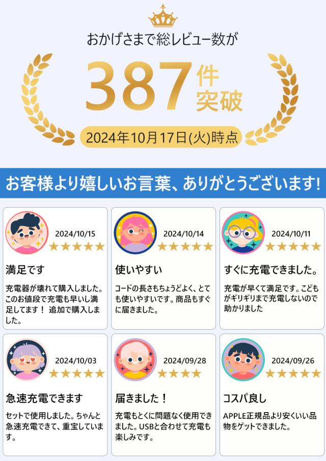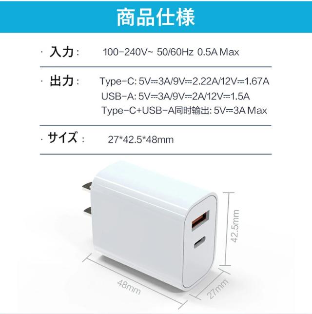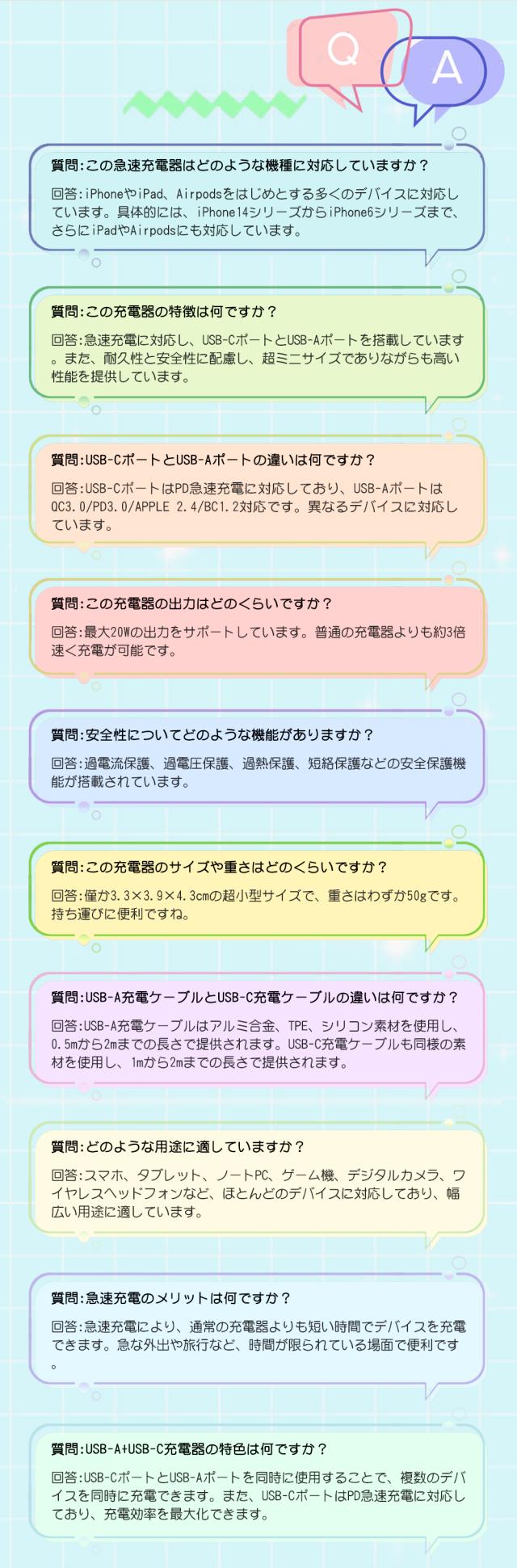 | Q: この急速充電器はどのような機種に対応していますか? A: iPhoneやiPad、Airpodsをはじめとする多くのデバイスに対応しています。具体的には、iPhone14シリーズからiPhone6シリーズまで、さらにiPadやAirpodsにも対応しています。 Q: この充電器の特徴は何ですか? A: 急速充電に対応し、USB-CポートとUSB-Aポートを搭載しています。また、耐久性と安全性に配慮し、超ミニサイズでありながらも高い性能を提供しています。 Q: USB-CポートとUSB-Aポートの違いは何ですか? A: USB-CポートはPD急速充電に対応しており、USB-AポートはQC3.0/PD3.0/APPLE 2.4/BC1.2対応です。異なるデバイスに対応しています。 Q: この充電器の出力はどのくらいですか? A: 最大20Wの出力をサポートしています。普通の充電器よりも約3倍速く充電が可能です。 Q: 安全性についてどのような機能がありますか? A: 過電流保護、過電圧保護、過熱保護、短絡保護などの安全保護機能が搭載されています。 Q: この充電器のサイズや重さはどのくらいですか? A: 僅か3.3×3.9×4.3cmの超小型サイズで、重さはわずか50gです。持ち運びに便利ですね。 Q: USB-A充電ケーブルとUSB-C充電ケーブルの違いは何ですか? A: USB-A充電ケーブルはアルミ合金、TPE、シリコン素材を使用し、0.5mから2mまでの長さで提供されます。USB-C充電ケーブルも同様の素材を使用し、1mから2mまでの長さで提供されます。 Q: どのような用途に適していますか? A: スマホ、タブレット、ノートPC、ゲーム機、デジタルカメラ、ワイヤレスヘッドフォンなど、ほとんどのデバイスに対応しており、幅広い用途に適しています。 Q: 急速充電のメリットは何ですか? A: 急速充電により、通常の充電器よりも短い時間でデバイスを充電できます。急な外出や旅行など、時間が限られている場面で便利です。 Q: USB-A+USB-C充電器の特色は何ですか? A: USB-CポートとUSB-Aポートを同時に使用することで、複数のデバイスを同時に充電できます。また、USB-CポートはPD急速充電に対応しており、充電効率を最大化できます。 | ||||||