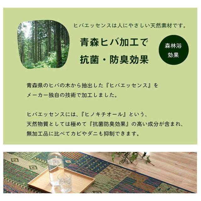 い草ラグカーペット。191x250cm。カラーは、ブルー(4550317097539:8198439)、ブラウン(4550317097553:8198489)、です。縦糸が多い為、細かく繊細で浮き上がって見えるのが特徴です。裏は滑り止め不織布付きで、滑る心配がありません。い草には空気の自然浄化作用、湿度の調節作用などがあります。い草にヒバエッセンス加工を施しています(抗菌防臭効果)。青森県のヒバの木から抽出した「ヒバ油」をメーカー独自の技術で商品に加工しました。「ヒバ油」には、ヒノキチオールという天然物質としては極めて抗菌性の高い成分が含まれ、医療や食品など多分野で利用研究が進められています。