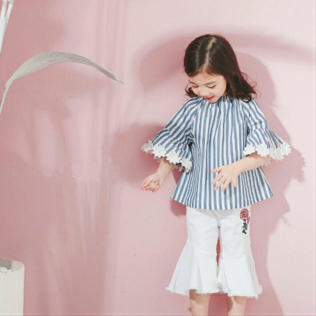 【SALE】【54%OFF】韓国子供服 子供用 女の子用スモック ブラウス ストライプ ストライプスモック 花柄レース 袖口レース 女の子 90 100 110 120 ベビー 子供服 キッズ かわいい お洒落 お洒落キッズ【メール便送料無料】