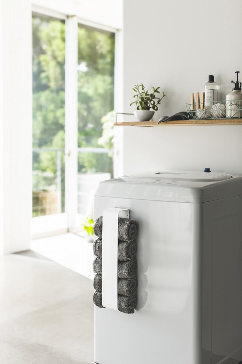 磁石で簡単取り付け。タオルを丸めて洗濯機や冷蔵庫側面などに収納。