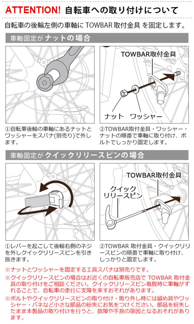 | AIRBUGGY NEST BIKE 本体は別売りです。 自転車の後輪左側の車軸に TOWBAR の留め具を固定し接続します。 自転車の前輪には取り付けは出来ません。 自転車の後輪右側には、車輪のチェーンやギアに取り付け金具が干渉する おそれがあるため、取り付けは出来ません。 ナットとワッシャーを固定する工具スパナは別売りです。 |