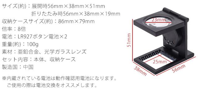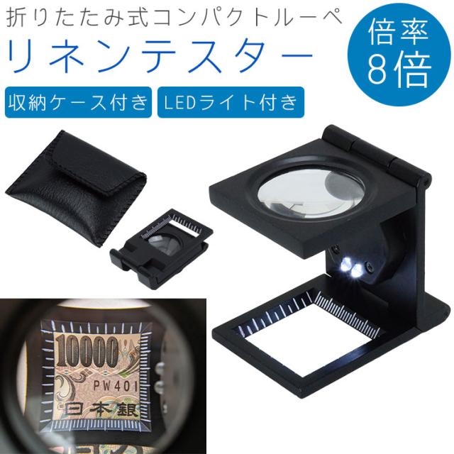 リネンテスター 折りたたみ式 ルーペ 縞見ルーペ LEDライト 倍率 8倍 目盛り コンパクト 収納ケース 付き 携帯 拡大鏡 検査 検品 測定 PR-TH-9005B【メール便 送料無料】
