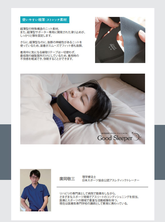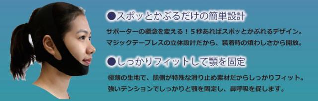 | 商品特徴 | (1)鼻呼吸を促す設計 伸縮性の高い生地で顎をホールドし、口を閉じて鼻呼吸にすることで、就寝時の睡眠が楽になります。 (2)マジックテープ接着などの手間なく、スポット被るだけなので、装着の煩わしさを軽減します。 (3)縁巻きがない仕様 切りっぱなしの生地なので就寝中に肌への痕残りが少なくなり、装着中のストレスも軽減します。 (5)ウレタンより使いやすく丈夫 ウレタンに比べ、高い伸縮性と滑り止め機能を持ち、しっかりとフィットしつつ、 繰り返し洗濯・使用できる丈夫さを、特徴としています・ |