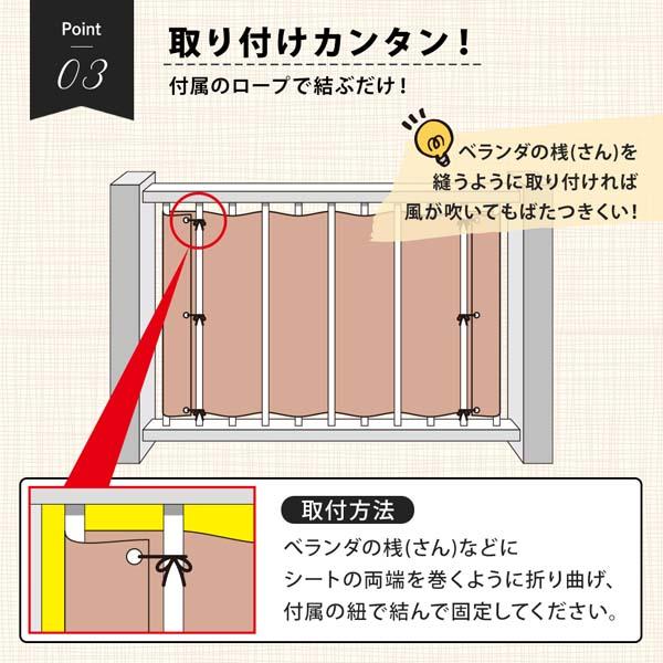| ベランダの桟(さん)などにシートの両端を巻くように折り曲げ、付属の紐で結んで固定してください。 | |