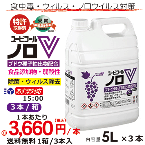 ノロウィルス・衛生管理対策 ユービコール ノロV 5L 3本セット/箱 まとめ買い ブドウ種子抽出物の力でしっかり除菌/ケース買い 業務用 食品添加物 エタノール製剤 アルコール