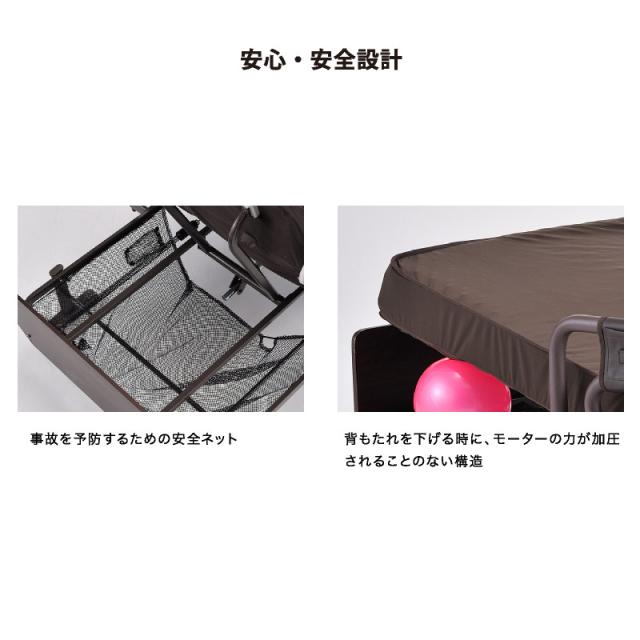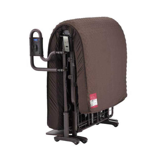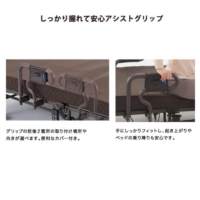 従来の収納式ベッドは構造上、どうしてもマット中央が分割されていました。便利なだけでなく、ベッドとしての寝心地をもっと良くしたいという思いから、マット材や設計の見直しを行い、マットを分割せずに、ベッドを折りたたむことが可能になりました。多層構造にすることでより快適な寝心地を目指した、厚み10cmのボリュームマットレスです。 1層目と2層目中央にはプロファイル加工を施したウレタンを使用し、通気性を確保しました。手元コントローラーで背もたれとフットアップが連動リクライニング。(※1モーター)。頭から優しく抱き起こされるような、自然な起き上がりが体感できるアテックスのオリジナルWファンクション機能のリクライニング。グリップは前後2個所の取り付け場所や向きを選べます。手にしっかりフィットして、起き上がりやベッドの乗り降りに安心です。