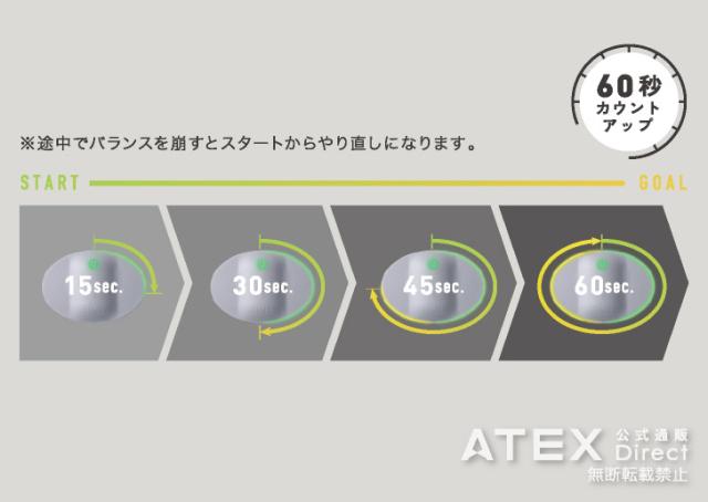 スタートするとリズム音が流れ、側面のLEDライトが点灯します。ライトが1周(60秒)するまでバランスを保てるようにチャレンジ。※途中でバランスを崩すとスタートからやり直しになります。音はON・OFFの選択が可能です。体全体の筋力を向上し、体幹を効果的に鍛え上げる