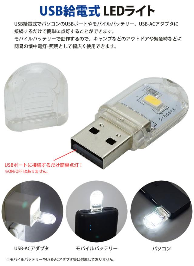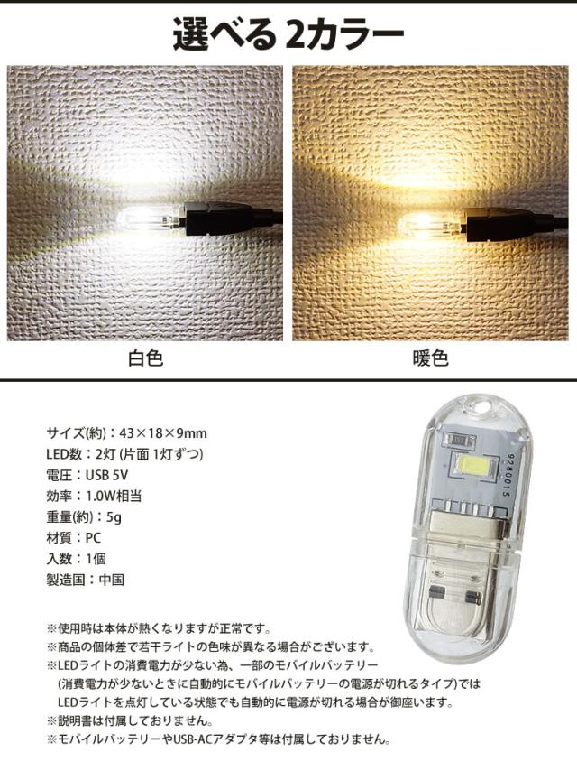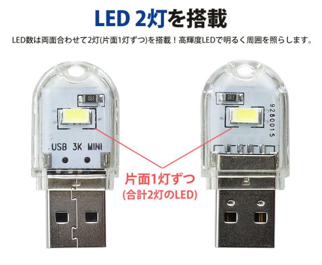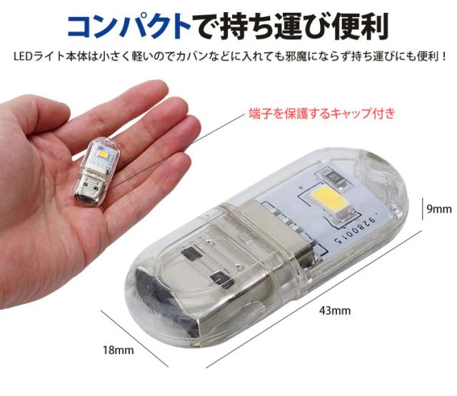 USB LEDライト ミニライト 両面発光 LED 2灯 小型 軽量 携帯 簡単点灯 キャップ付き コンパクト
