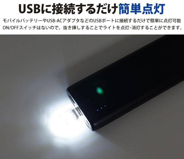 モバイルバッテリーやUSB-ACアダプタなどのUSBポートに接続するだけで簡単に点灯可能